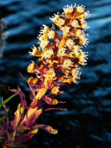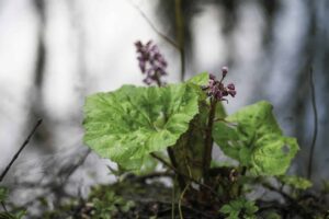 Lepiężnik różowy (Petasites hybridus)- rodzaj bylin z rodziny astrowatych rosnących w strefie umiarkowanej. Występuje prawie w całej Europie, Turcji, Kaukazie, natomiast w Polsce występuje najczęściej w Karpatach. Można go spotkać na terenach wilgotnych lub podmokłych takich jak m.in. rowy, wąwozy, brzegi mórz. W niektórych miejscach tworzą duże skupiska. Roślina ta posiada ogromne liście osiągające średnicę około 60 cm, które wydzielają charakterystyczny, nieprzyjemny zapach. Liście te wyrastające bezpośrednio z kłącza nazywane są liśćmi odziomkowymi. Rozwijają się one dopiero po przekwitnięciu kwiatów. Drobne kwiaty tej rośliny zebrane są w koszyczki, a te w grona na szczycie łodygi. Koszyczki składają się z małych, różowych kwiatów, które w zależności od okazów mogą być męskie lub żeńskie. Owoce lepiężnika- niełupki- zakończone są puchem, umożliwiającym przenoszenie ich przez wiatr na dalekie odległości.